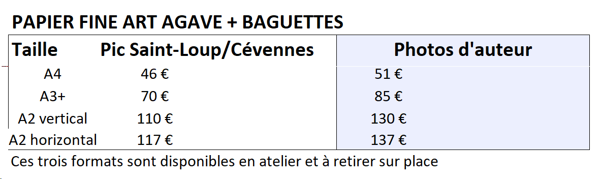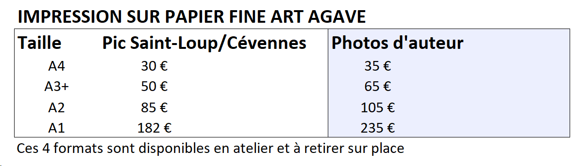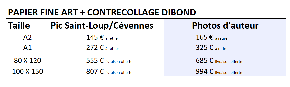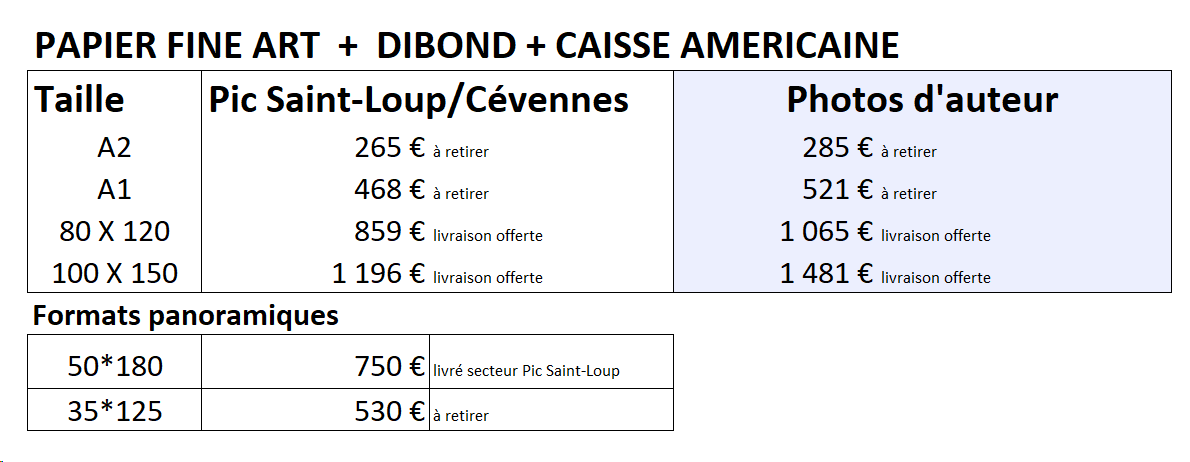 Toutes les photographies présentées sur les réseaux ou sur ce site, sauf cas particulier, sont disponibles à la vente sous forme de tirages, dans les déclinaisons suivantes :